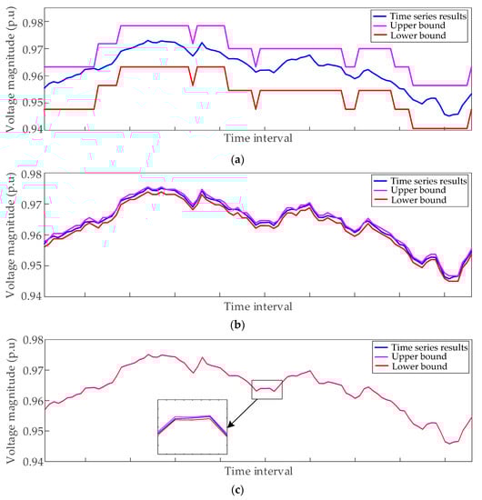 The reason for the conservative estimation of hosting capacity can be further explained through the time series results of bus voltage. Figure 7 presents the 1-day snapshot of the time series voltage curves at Bus 18. The blue curve denotes the accurate results obtained by the comprehensive load flow method. Three different △d, i.e., 0.1 p.u, 0.01 p.u, and 0.001 p.u, are conducted as the comparative cases. For these cases, the corresponding results in Table 2, i.e., 9.46 MW, 10.77 MW, and 10.86 MW, are used to calculate the upper and lower bounds of bus voltage. As described in Section 3.2, the upper bounds of the voltages are calculated using the lower and upper bounds of load and wind power bins, respectively. The lower bounds can be calculated using the opposite rule. It is evident from the results that the accurate voltage curve is always contained by the range of upper and lower bounds in each case. Therefore, when the corresponding hosting capacity in each case is applied to the actual time series data, it can be guaranteed that no voltage violation occurs. The comparison of the upper bounds of the voltages in different cases can explain the conservatism of the obtained hosting capacity. When △d is relatively large, the upper bound of voltages is overestimated, and the voltage violation can be observed with less DG capacity. In contrast, when △d is appropriately selected, the interval between the upper and lower bounds of voltage is much narrower than those with larger bin widths. Under such circumstances, the hosting capacity can be accurately estimated.