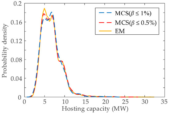 The variance coefficient, β, should be appropriately selected to ensure the accuracy of the obtained results. Therefore, we consider two different values of β, i.e., 1% and 0.5%, to provide comparative results. Assume that there are four buses in each deployment scheme that are the candidate locations for DG integration. Under such circumstances, the total number of potential deployments can be obtained by the enumeration method (EM). The hosting capacity results of a total of 35,960 deployment scenarios are treated as accurate results. The mean and standard deviation (STD) values of hosting capacity obtained by EM are 6.66 MW and 2.45 MW. As a comparison, the results obtained by MCS are presented in Table 3. The trial number required by MCS with two different β values are 1300 and 5400, respectively. It can be found that the approximated results are more accurate when stopping criteria is relatively small. Figure 8 presents the comparisons between the probability distribution curves. The results indicate that MCS can well approximate the accurate curves obtained by the EM with β set to 0.5%. Therefore, in the following case study, the stopping criterion of MCS is set as β ≤ 0.5%.