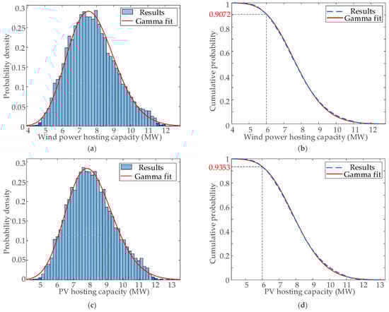 Figure 9 presents the probability distributions of wind power and PV hosting capacity under 50% location penetration. The results are shown using histograms and cumulative probability curves. It can be found that Gamma distribution can approximate both wind power and PV hosting capacity. Moreover, the obtained results with other location penetrations also follow the same rule. The histograms provide the estimations of extreme values of hosting capacity. For wind power hosting capacity, the obtained minimum and maximum values are 4.10 MW and 12.65 MW, respectively. As a comparison, the corresponding results for PV hosting capacity are 4.26 MW and 13.21 MW, respectively. The difference between the extreme values is partly due to the locations of DG. In general, the relatively high hosting capacity can be obtained with DG located near the first bus. Figure 9b,d presents the cumulative probability curves of hosting capacity. These curves provide system planners with a straightforward tool for estimating the probability of having a hosting capacity higher than a specific value. For example, the probability of having wind power hosting capacity higher than 6 MW is 0.9072, while in the PV case, the result is 0.9353.