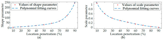 Based on the hosting capacity results with different location penetrations, the curves of the parameter of Gamma distribution to location penetration can be obtained and fitted by the fifth-order polynomials, as shown in Figure 10. These curves can provide planners with useful information. For instance, when the location penetration is 35%, system planners can utilize the curve to obtain the shape and scale parameters and estimate the probability distribution of hosting capacity under the target location penetration. Moreover, once such curves are established for a specific distribution system, the probabilistic hosting capacity of the system with any location penetration can be obtained without simulating thousands of DG deployment schemes.