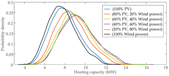 Monte Carlo simulation is performed to generate various DG deployment schemes. For a specific DG deployment scenario, the percentage of wind power generation is increased from 0% to 100% with 5% increment steps. The proposed framework is performed to calculate the corresponding hosting capacity. Figure 11 presents the probability distributions of the obtained hosting capacity results with different wind power percentages. As the ratio of wind power increases, the transition of hybrid DG hosting capacity follows a two-stage process. In the first stage, the probability distributions of hosting capacity shift toward the right until the percentage of wind power reaches 75%. In the second stage, as the proportion of wind power continues to increase, the probability distribution curves of hosting capacity move to the left.
