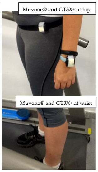 The GT3X+ and the Muvone® are portable lightweight devices (GT3X+: 27 g, 3.8 cm × 3.7 cm × 1.8 cm; Muvone®: 9 g, 3.2 cm × 3.2 cm × 1.1 cm). Participants wore a securely adjusted belt containing a GT3X+ and a Muvone® positioned over the non-dominant hip (iliac crest). A securely adjusted wristband containing a GT3X+ and a Muvone® was attached at the non-dominant wrist (upper wrist crease). Thus, two pairs of GT3X+ and Muvone® units were used and taped together to ensure axis alignment. Figure 1 depicts the placement of the accelerometers. At the end of each exercise bout, researchers ensured that both belt and wristband continued to be adequately fitted.