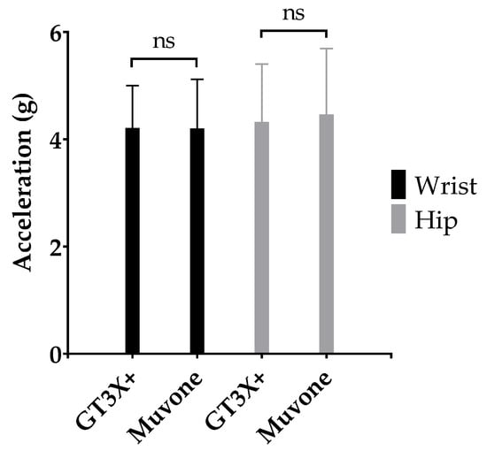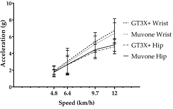 The comparison between peak acceleration means measured by GT3X+ and Muvone® at the hip and wrist during treadmill bouts (4.8, 6.4, 9.7 and 12 km·h−1) can be observed in Figure 3. Non-significant differences were found between the two activity monitors as evidenced by dependent t-tests.