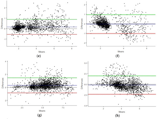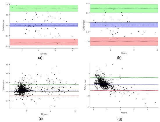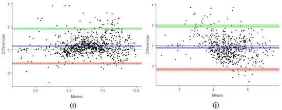 Bland–Altman plots. High agreement between the devices was shown for every test and location: (a) Test: CMJ. Accelerometers location: Wrist. (b) Test: CMJ. Accelerometers location: Hip. (c) Test: Treadmill 4.8 km·h−1. Accelerometers location: Wrist. (d) Test: Treadmill 4.8 km·h−1. Accelerometers location: Hip. (e) Test: Treadmill 6.4 km·h−1. Accelerometers location: Wrist. (f) Test: Treadmill 6.4 km·h−1. Accelerometers location: Hip. (g) Test: Treadmill 9.7 km·h−1. Accelerometers location: Wrist. (h) Test: Treadmill 9.7 km·h−1. Accelerometers location: Hip. (i) Test: Treadmill 12 km·h−1. Accelerometers location: Wrist. (j) Test: Treadmill 12 km·h−1. Accelerometers location: Hip. The green band depicts the 95% confidence interval for the upper limit of agreement, the blue band depicts the 95% confidence interval for the mean bias, and the red band depicts the 95% confidence interval for the lower limit of agreement.