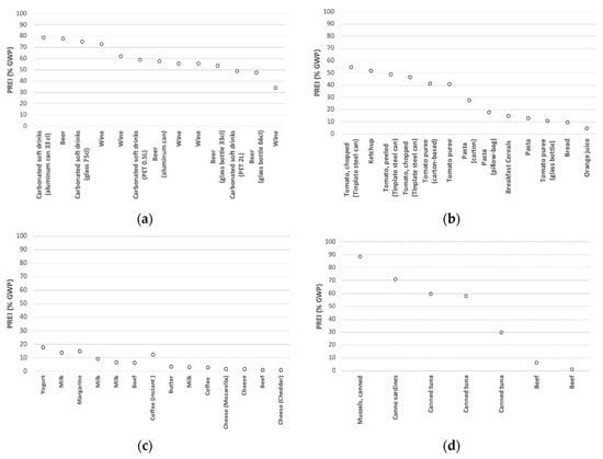 Packaging relative environmental impact (PREI) for beverages (a), raw and processed crops and vegetables (b), farmed and dairy products (c), and muscle-based products (d). Adapted from (Licciardello, 2017) [25].