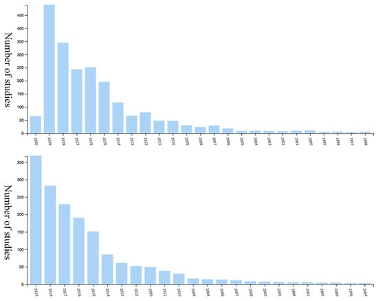 Number of studies with respect to years by including the keywords “consumer research” + “sustainability” (top); “consumer behavior” + “sustainability” (bottom) from Web of Science search on March 9, 2020.