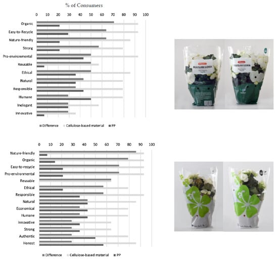Research Question and Methodology: In the first case study, packaging labeling for a cellulose-based flower pouch was evaluated against a Polypropylene control sample applying the Value Toolkit®, a tool developed for evaluating consumers’ packaging value perceptions [88]. The research question asked if the branded logo and sustainability information of the cellulose-based material would affect consumers’ value perceptions, willingness-to-pay (WTP), and likelihood-of-purchase (LOP). During the first evaluation round, consumers were asked to match a set of pre-defined value attributes with two PP samples along with stated WTP and LOP. Next, packages with the brand logo and some verbal information on cellulose-based material were presented to assess the same set of value attributes, WTP, and LOP. Fourteen female participants with an average age of 44, who stated interest in environmental issues and sorted packaging waste regularly, were selected to participate in the study conducted as two focus group discussions.