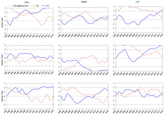 3.2. Mutation Characteristics of NDVI and Climate Factors in the Huaihe River Basin