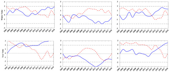 - Luo, L.S.; Xu, M.; Liang, S.X. Stability analysis of the interannual relationship between El Nino/La Nina and the summer rainfall over Huaihe River basin. Meteorol. Mon. 2018, 44, 1073–1081. [Google Scholar]