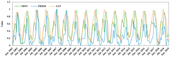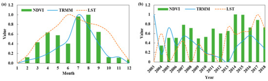 3.3.3. Effects of TRMM and LST on Vegetation Growth