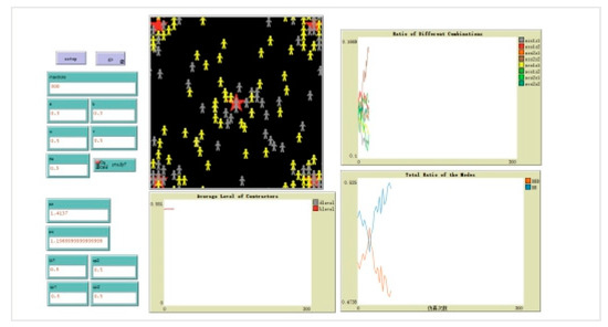 The NetLogo was used in the simulation model. NetLogo is a multi-agent programmable modeling environment. It powers HubNet participatory simulations, and it is authored by Uri Wilensky and developed at the CCL (Center for Connected Learning). NetLogo is suitable for simulating the evolution process over time. It can command multiple agents to observe their behavior interaction, so as to realize research on individual behavior and the macro model at the micro level [45].