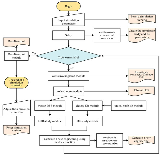 Based on Multi-Agent Systems (MAS) [42], a decision-making simulation model for PDS was constructed. The simulation model used the DBB and DB as simulation objects, and it was carried out to simulate the behaviors and interactions of each subject by abstracting the subject in the decision-making process of PDS (refer to Figure 2), after which the macro-decision behaviors of the PDS emerged [43]. According to the decision-making mechanism of PDS, this paper abstracted the owner agent and contractor agent, and the contractor agent was divided into the design contractor agent and build contractor agent according to the professional and technical advantages.