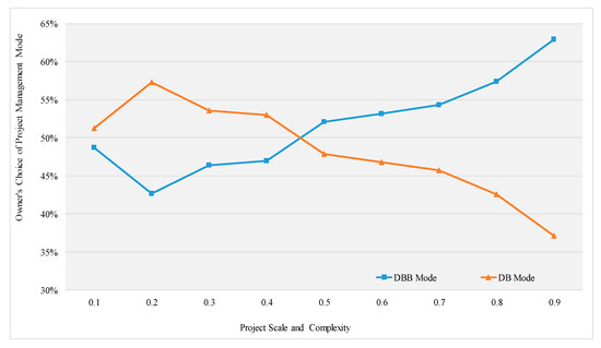 - When the scale and complexity of the project were low (range 0.1–0.4), owners tended to choose DB. With the expansion of the project scale and complexity, the difficulty of the management coordination of the project increased gradually. In order to effectively avoid adverse effects such as costs and construction risks, the owner tended to transfer the construction and management tasks to the contractor with a more extensive experience and high technical level as far as possible, so owners tended to choose DB.