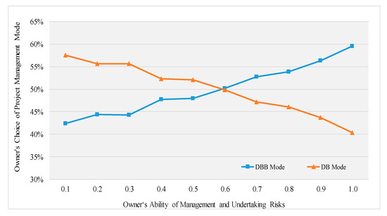 - In the situation where the owner’s ability is low (range 0.1–0.6, as shown in Figure 8), the owner tended to choose the DB. This is because the owner only needs to sign a contract with the general contractor in DB, which helps to economize construction costs and reduce the management difficulty. With the continuous improvement of the owner’s ability (range 0.6–1.0, as shown in Figure 8), the owner is more inclined to control the construction process directly. The reason for this is that the owner has enough management ability and ability to cope with risks. The owner can control the progress of the project through the DBB, which effectively economizes construction costs and ensures the quality of the project construction.