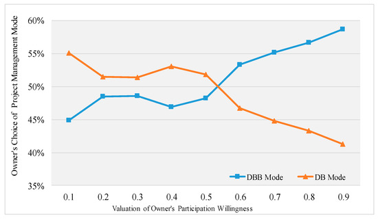 - When the owner’s willingness to participate in the project is low (range 0.1–0.5, as shown in Figure 9), the owner does not have the willingness to control the project. The DB can reduce the workload of the owner, so the owner is inclined to select the DB. With the increase of the owner’s willingness to participate in the project (range 0.5–1.0, as shown in Figure 9), the owner tends to control the project, so more DBB will be selected, and the owner will strictly control the design scheme and construction process.