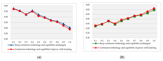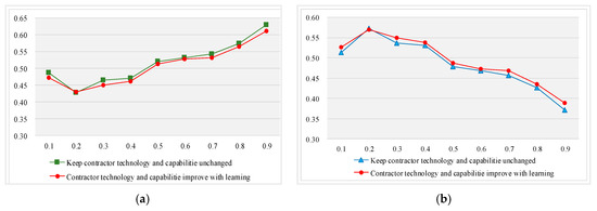In the experiment, we fixed the other parameters as being unchanged. Scenario 1: the contractor’s ability does not change, take study? = False. Scenario 2: the contractor’s ability grows within a certain period, take study? = True; we fixed the other parameters as shown in Table 10.