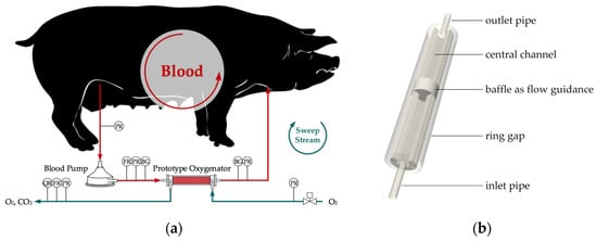 The prototype module can be seen in Figure 2b. A hollow fiber mat was coiled up around the coaxially positioned inlet and outlet pipe (outer diameter, 6 mm). Hence, a hollow fiber packing in the form of a hollow cylinder was shaped. The packing has a central cylindrical channel with 6 mm diameter as well as an outer diameter of 16 mm and is inserted into a pipe with 20 mm inner diameter as the module shell. This leaves a 2 mm ring gap between packing and shell. In the middle of the module, a baffle blocks the blood flow in the central channel and forces a transverse flow through the packing. The hydraulic diameter of the central channel and the ring gap are comparable, to promote homogenous blood distribution. The packing with an active fiber length of 100 mm is potted on both ends of the shell pipe. Sweep gas is distributed or collected at the end of the lumen via end caps (not shown in Figure 2b). Approximately 500 fibers (Membrana Oxyplus® 90/200 PMP, 3M) were incorporated into the module. Tangential and radial spacing between the fibers measures 200 µm.