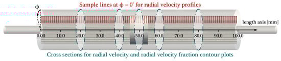 The radial velocities were sampled on lines parallel to the longitudinal axis, which were positioned exactly between two fibers. Sample lines were positioned at four different angles (0°, 90°, 180°, 270°—Figure 3a) to eliminate dependencies from the angular position. Due to the higher flow cross-sections at outer fiber mat windings, the radial velocity magnitude decreases in a radial direction. As the rectangular reduced geometry cannot account for this velocity decrease, sample lines were defined for all eight windings (layers). This allows the computation of an inlet velocity, which can represent the average radial velocity of blood flowing through a packing segment similar to the reduced geometry. Effects of this simplification on the prediction performance of the proposed method are discussed in Section 3.4. Two hundred samples, distributed homogeneously on the longitudinal axis, were taken per line (Figure 4). The arithmetic average of all samples on all lines (6400 points) was calculated to gain a representative mean radial velocity (uradial).