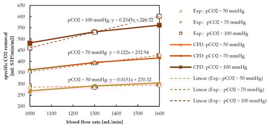 Experimentally and numerically determined specific CO2 removal at different flow rates and pCO2 at the blood inlet of the prototype oxygenator.
