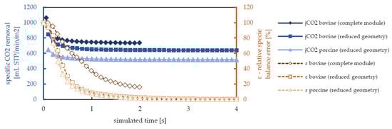 The given data suggests that, for relative species balance errors lower than 30%, the predicted CO2 removal differs from the converged solution by maximally 10%. The CO2 removal for bovine blood, determined by the simulations of the complete and reduced geometry, deviates by approximately 10% (Figure 11). The error introduced by the reduction of the geometry can therefore be regarded as acceptable. The difference in transmembrane CO2 flux for bovine and porcine blood (jCO2, Figure 11) can be explained by the chosen permeances (new fibers—bovine simulation versus used fibers—porcine simulations).