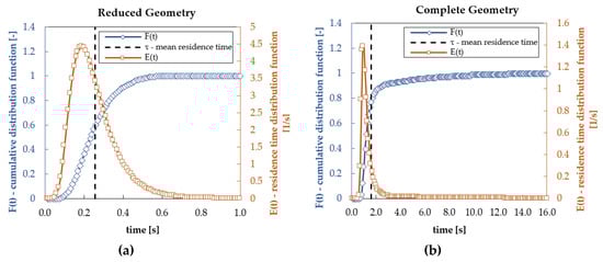 Residence time distribution, E(t), and cumulative distribution function, F(t), for (a) reduced geometry; (b) complete geometry.