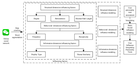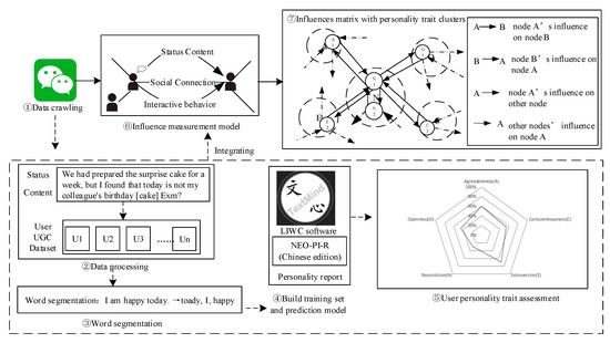 User influence proposed by Katz and Lazarsfeld means that the individual’s behavior and thoughts are influenced by others [5]. Influence plays a vital role in daily life and decision-making, and mainly works in information dissemination [6], link prediction [7], opinion leader mining [8], and advertising [9]. As the mainstream social software in China, WeChat is a popular platform for users to share information, express themselves, and show their individuality. The user influence of WeChat Moments can also be measured from three aspects: topology, status information, and social behavior. Most of the current influence models only focus on one certain dimension, so the applicability of the model is low. For example, the influence model based on topology only focuses on the nodes and the relationship between nodes, and there is a big difference between the actual information dissemination modes. Therefore, some scholars have proposed to link the influence model with some instances. Some scholars have introduced factors such as emotion [10] and topic clustering [11] to improve the model. We reviewed the current research status of personality traits from the perspectives of personality trait language-behavior feature analysis and personality trait assessment. Human behavior is largely influenced by personality traits. However, there are relatively few related studies about influence model introducing personality factors, the individualization is not fully considered. In daily life, due to other people’s evaluation, social identity, personal likes and dislikes, the influence of the same user on different traits audience varies. The integration of personality traits fully considers the effect of individualized differences on user influence and has an important significance for accurately measuring user influence, which is helpful to opinion leader mining and link prediction.