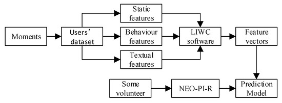 Due to the limitations and subjectivity of NEO-PI-R, in recent years, scholars have proposed machine learning for personality assessment based on textual analysis. Yaekoni obtained the dataset from blogs and found systematic linkages between personality and differences in vocabulary using, Furthermore, he emphasized the value of complementary methods in the study of personality assessment [18]. We crawled the cache database, obtained the social behavior dataset, and assessed some users’ traits by NEO-PI-R, then we used the LIWC dictionary (LIWC, Linguistic Inquiry and Word Count, Which is the text analysis tool based on word measurement in Chinese) to construct feature vectors, refer to Tandera et al. [19], selected the prediction model with the best index to assess the rest of the users. The personality traits prediction flow is shown in Figure 2.