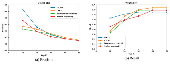 According to Figure 9, Figure 10, Figure 11, Figure 12 and Figure 13, we can see that IPUIM performs better than the other three. Besides, we can observe that these models’ precision line become lower and closer between Top-40 and Top-50, because as the number of Top-k increased, fewer and fewer key opinion leaders were found in the unit interval. In other words, with the increment of Top-k, the unit interval’s value density decreases. In addition, in the header Top-k interval, the recall rate of the proposed approach is better than the other three models. Comparing the five pictures above, we can realize the necessity of considering the difference of audience and explore the role of personality traits in user influence.