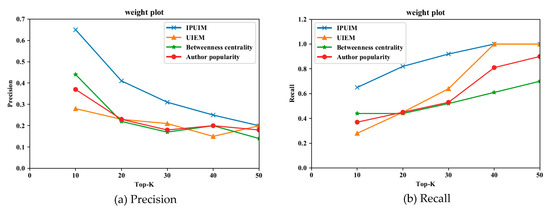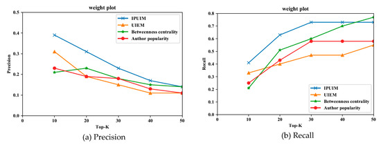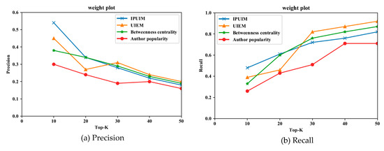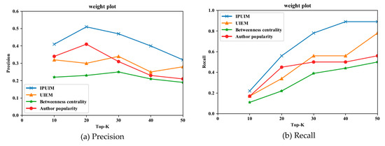 In order to validate the validity and accuracy of the IPUIM, we compare it with the three kinds of influence measurement models, exploit repetition rate, ranking accuracy, and recall rate to evaluate the result of user influence measurement. Three selected influence measurement models are betweenness centrality, author popularity, user influence evaluation method based on topic and node attributes (UIEM). WeChat does not have a status forwarding jump mechanism, so we use betweenness centrality as a measure of influence based on a structural perspective. Betweenness centrality is the most classical structural measurement used to find the influencers in the social network [13], as shown in Equation (1). UIEM is a measurement model based on social convergence theory, which shows that users are more inclined to interact with people similar to themselves [28], we adjusted it to fit WeChat Moments. Author popularity is a common approach that can identify the opinion leaders based on the interaction between visitors and authors [29], as shown in Equation (13):
