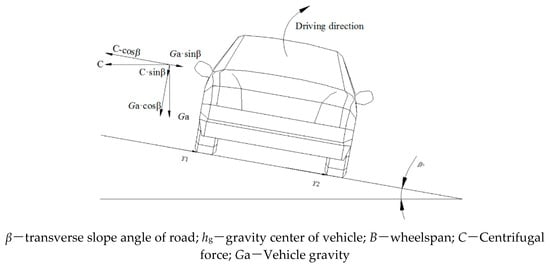where V is the vehicle speed (km/h), μ is the lateral force coefficient, and i is the road transverse slope. When a vehicle operates inside of the curve, we define Equation (6) as “+”, and when a vehicle operates outside of the curve, we define Equation (6) as “−”.