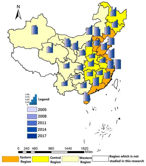 In the past forty years since China’s social and economic reforms and opening-up, the economy has rapidly developed into what is now the second largest economy in the world. However, problems concerning ecological systems and biodiversity as well as environmental issues cannot be ignored [4]. The Chinese government has begun to pay attention to sustainable development and has made a series of efforts in that regard [5]. In 1994, the Chinese government compiled “China’s Agenda 21: China’s White Paper on Population, Environment and Development in the 21st Century,” which integrates sustainable development into the long-term planning of China’s economy and society for the first time. In 1997, the 15th National Congress of the Communist Party of China adopted sustainable development as a strategic goal of China’s development and emphasized it in subsequent sessions of the National Congress of the Communist Party of China. The emphasis on sustainable development in China has been increasing in recent years. However, due to China’s economic slowdown, resource constraints, and other factors, ecological deterioration among other issues have seriously affected the rate of economic and social development [6]. Therefore, China must shift its emphasis from a rapid rate of economic development to enhancing sustainable development efficiency.