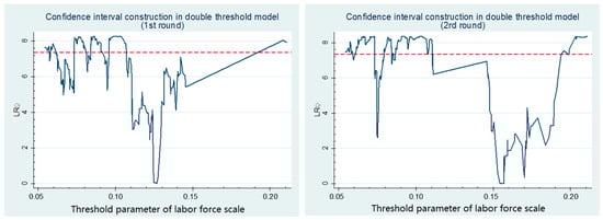 The threshold was tested for labor force scale, education scale, economic scale, enterprise scale, and traffic scale, with results located in Table 4. The LAS for labor force and enterprise did not pass the single threshold effect test. The LAS for enterprises did not pass the test of the triple threshold effect, and the remaining threshold variables were tested using the triple threshold test under the 10% level. Therefore, all the threshold variables are analyzed by the double threshold test because (1) all the threshold variables passed the double threshold test; (2) the significance of the double threshold test of the threshold variables is greater than the single threshold test and the triple threshold test.