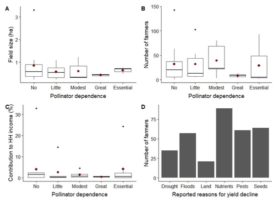 (A) Field size used for crops of different levels of dependency on animal pollination. (B) Number of farmers growing crops of different dependencies on animal pollination. (C) Contribution to household (HH) income from crops of different dependencies on animal pollination. (A–C) Boxplots showing observed averages (diamonds), medians (midline), and 75th and 25th percentiles (upper and lower limits of the box). The whiskers extend up to 1.5 times the interquartile range; data beyond that distance are represented as points. (D) Reported reasons for yield decline, and the number of farmers reporting each type of reason.