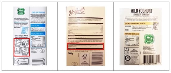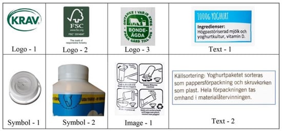 Different graphical elements, such as logos, symbols, images and texts that can be perceived as relating to attitude, recycling and environmental knowledge, were discussed with the participants using questions Q4 and Q5. These are usually found on the packaging used in the study, and are shown in Figure 2. The discussion aimed to identify the way that the participants perceived these elements (e.g., if they were seen at all, and if they were perceived as giving useful information) and if some elements were more useful than others. The aims of these elements, which was retrieved from producers, are elaborated on in Appendix A [88,89,90]. Symbol-1 & 2, Text-1 and 2, as well as Logo-1, 2 and 3, target attitude and environmental knowledge. Symbol-2, Image-1, and Text-2 are intended to enhance recycling knowledge, therefore motivating separation and sorting.