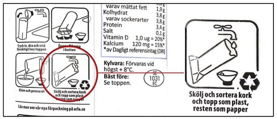 From a psychological perspective, this could be due to consumer desire to achieve a successful habitual performance, such as purchasing a product after having read its ingredients [95]. As marketing research has shown, consumers tend to search for desired information, such as ingredients, at the same place on all packaging [96]. Hence, proper arrangement of information, as well as giving it priority over other information on the package, whether it be text, logos, or symbols, could increase communication with consumers, which is also known as the hierarchy of information [97]. As previous research has shown, giving salient items a high priority on the packaging, by using, for example, visual elements, stimulates consumer attention [98]. This requires a delicate balance between visual and verbal attributes. Even small details may affect how consumers interpret the information, and can negatively affect consumer attitude. For example, using a small font for the sorting information may decrease the value of the information, giving it a lower priority to other information. As expressed by one of the participants: “It has always surprised me that this information is really important. Why do they write it in a smaller size compared to other information that is provided?” The main reason is that readers perceive a larger font as being more important [99]. Generally, selecting the right font size depends on certain variables, such as the purpose of the text, the place on packaging, the age of the main user, and the distance between the consumer and the package, whether it is on the shelf or in the consumer’s hands. However, a size between 12pt–16pt appears to be large enough to be read by consumers. Also, black font on a white or light color background is widely known to be the best combination to enable reading [96,100,101]. In addition, it would be less confusing if different producers use the same terms for a specific purpose. For instance, Lidl, a company in Sweden, used the term ‘sorting’ (Källsortering in Swedish (sorting)) to guide consumer sorting of packaging while Arla used ‘recycling’ (Återvinn in Swedish (recycling)) for the same purpose.