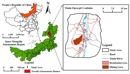 The study site is the Yimin open-pit coal mine (119.650°E to 119.764°E, 48.539°N to 48.645°N), located in Ewenki Autonomous Banner, Hulun Buir City, Inner Mongolia Autonomous Region, China (Figure 1). Located in the eastern region of Hailar Basin on the West slope of the Greater Khingan Range, this area comprises approximately 886.24 km2. The terrain consists of a basin, hills, and mountains, with an elevation of 644–781 m. The basin is located in the central portion of the study area, where frequent strong air exchange results in large temperature variations. The eastern and western regions of the study area are characterized by a generally high, flat topography with vegetation, artificial lakes, and residential areas interspersed across the landscape.