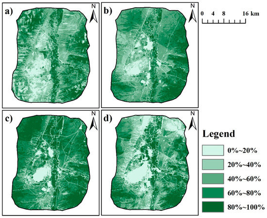 The vegetation fractional coverage in 1999 (a), 2006 (b), 2011 (c), and 2017 (d).