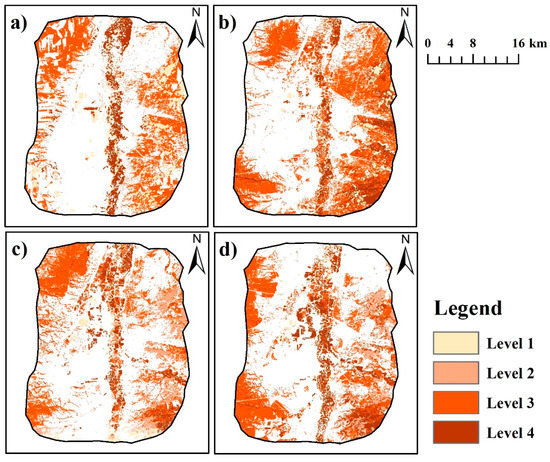 The comprehensive quality evaluation maps of patches (CQEMP) in 1999 (a), 2006 (b), 2011 (c), and 2017 (d).