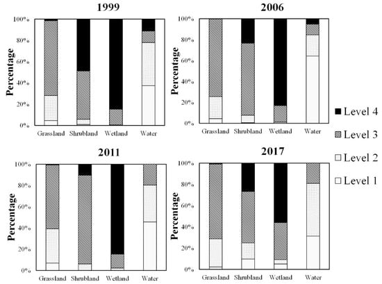 Figure 7 shows that wetland and shrubland ecosystem types comprised the majority of HQ Levels 3 and 4, while water and grassland generally ranked lower. The percentage of wetland rated Level 4 was 84.75% in 1999, 83.21% in 2006, 84.62% in 2011, and 55.99% in 2017. The percentage of shrubland rated Level 3 was 45.37% in 1999, 68.95% in 2006, 83.54% in 2011, and 48.35% in 2017. During the study period, the Levels 3 area of grassland accounted for about 2/3, indicating that the habitat quality of most grassland was good. Therefore, the patches with higher habitat quality (Levels 3 and 4) are located in the wetland of the Yimin River Basin, the shrubland in the east, and some of the grassland patches in the eastern and western regions of the study area. Level 1 and Level 2 are mainly distributed in the water and part of the grassland. The results indicate that both wetland and shrubland play an important role in overall habitat quality.