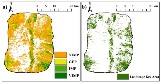 The CQEMPs for 1999, 2006, 2011, and 2017 are superimposed and graded, as shown in Figure 11a. By extracting Very Important Patch (VIMP), Important Patch (IMP) and General Patch (GEP) as ecological sources, the landscape key area recognition results could be obtained, comprising approximately 177.35 km2 in Figure 11b.