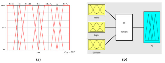 Step 2: A combination of data sources to define the values the weights of each indicator that was attributed is used to establish the MISO model through all the input variables in Xi; the qualification of these indicators over the practice that was reached and the degree of influence of these indicators on the supplier selection can be used to study the suppliers of the sample. The fuzzy sets obtained are combined by the membership function, which creates a single output according to the MISO model and defines it as Yi output values among the alternatives by the indicators (see Figure 2b). The IFS application can establish the A(i,j) matrix, which must be converted in values by the process of the defuzzification model with an interval of 1 to 4.