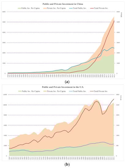 Economists have long discussed how to predict global and country-specific market fluctuations, recessions, economic turmoil, and financial crises, and how to correct these problems for the welfare of nations. Therefore, many macroeconomic factors have been investigated to find a robust model and framework explaining past performance and determining the future behavior of the economies. In this regard, investment and economic growth have been studied by many researchers in the literature since the late 1970s, describing the change in the macroeconomic dynamics, particularly, in both developed and developing countries. There is a complex relationship between public-private investment and economic growth. They affect each other and depend on many external factors such as the capacity of human resources [1], geographical and cultural conditions [2], natural resources, income taxation [3,4], debt-based investing [5], and the political regimes [6]. This study investigates the interrelations of public-private investment and economic growth in the U.S. and China in order to reveal nonlinear causal relations and comparatively discuss policy implementations and potential implications.
