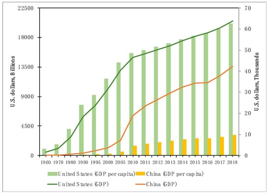 Gross domestic product (GDP) is a widely utilized measure of a country’s overall economic activity, and the change in GDP corresponds to economic growth. This study gathers the GDP data of the U.S. and China from the International Monetary Fund (IMF) [8]. Public and private investment might have an influence on sustainable economic growth. Public investment can be considered a source that provides physical assets for the benefit of the public by providing economic infrastructure (such as highways, railways, seaports, airports, and power plants) and social infrastructure (such as schools, universities, and hospitals). Private investment, on the other hand, is recognized as profit-driven financing by private entities in order to maximize their benefits. In this study, public and private investments span the time between 1960 and 2015. The data is collected from the IMF Fiscal Affairs Department [31,32]. All variables collected in this study are expressed in the logarithm for analysis.