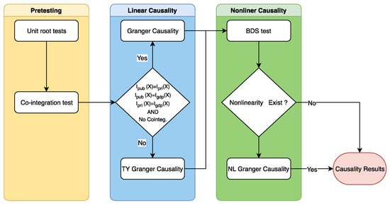 In the linear causality stage, the study examines the conditions that resulted in the pretesting stage. If the time series is stationary and there is no pairwise cointegration, then the linear causality is examined by the Granger test. If the condition is not satisfied, then the Toda-Yamamoto Granger test is performed for further analysis of the linear causality. In the last step, the BDS test is conducted to ascertain the existence of the nonlinear behaviors in the given time series. The nonlinearity test is performed for variables when the null hypothesis of the BDS, which is a series of independent and identically distributed random variables, is rejected [37]. In the case of the nonlinearity in a given time series, the study performs the nonlinear Granger causality test.