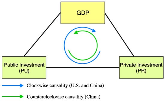 Figure 4 illustrates the strong and common causal relationship between the U.S. and China for sustainable economic growth among public and private investment and economic growth. The findings show that there is a feedback loop in either or both directions (i.e., clockwise or counterclockwise or both) of the causality chain through PU–GDP–PR–PU (see Figure 4). In the U.S., private investment promotes public investment, and this leads to economic growth. Last, economic growth feeds back to private investment. This chain forms a feedback loop in a clockwise direction between public and private investment through the GDP which sustains economic growth. On the other hand, China has the feedback loops in both directions for indirect transitions from public to private investment through the GDP and vice versa. This result implies that the existence of the feedback loop in Figure 4 is necessary for sustainable economic growth, which is a common behavior in the U.S. and China, but the direction of the loop can be determined by the socio-economic regimes of the countries. This assumption can be expanded to other countries with different levels of development and different political environments.