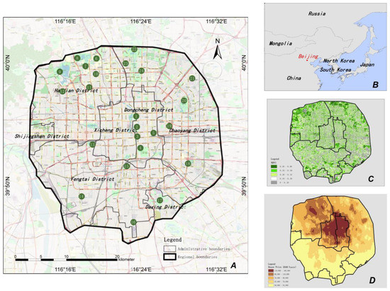In this study, the core urban area of Beijing—the area within the Fifth Ring Road of the urban expressway—was selected as the study area (Figure 1A). The study area includes 7 administrative districts (including all of Dongcheng District and Xicheng District, as well as most of Chaoyang District, Haidian District, Fengtai District, and Shijingshan District and Daxing District), with a total area of approximately 667 km2.