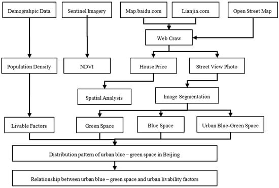 In view of the above problems, the authors planned to apply internet big data and image recognition technology supported by artificial intelligence to extract urban blue–green space information. The authors attempted to characterize the spatial distribution pattern of blue–green space in Beijing. Additionally, this study explores the relationships between blue–green space and satellite remote sensing indicators, urban housing prices, and population density. The authors tried to answer the following three questions: