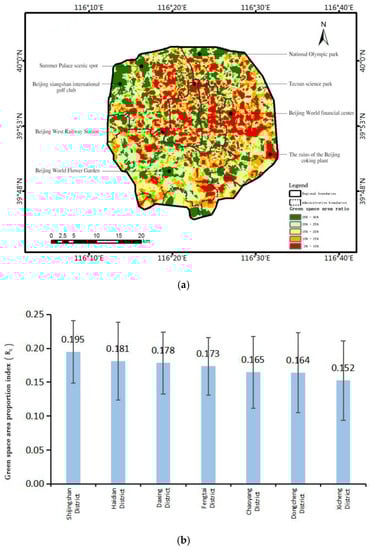 Spatial distribution of the green space in Beijing; (a) Green space area proportion index () on a 200-m pixel scale; (b) statistics about green space area proportion index () in different districts.