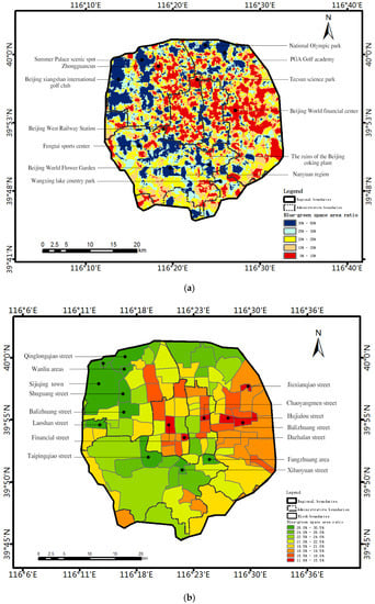 Spatial distribution of the blue–green space in Beijing. (a) blue–green space area proportion index () on a 200-m pixel scale; (b) blue–green space area proportion index () on a city block scale.