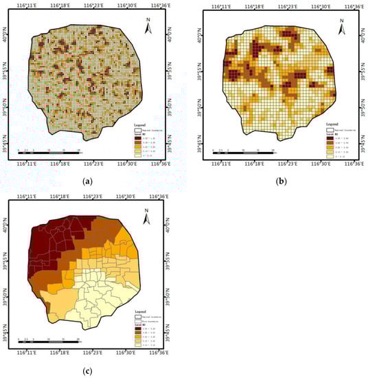 Spatial distribution of fitting degrees between the NDVI and green space area proportion index (); The pixel scale is 500 m (a), 1000 m (b), and city block (approximately 2000–20,000 m) (c) respectively.